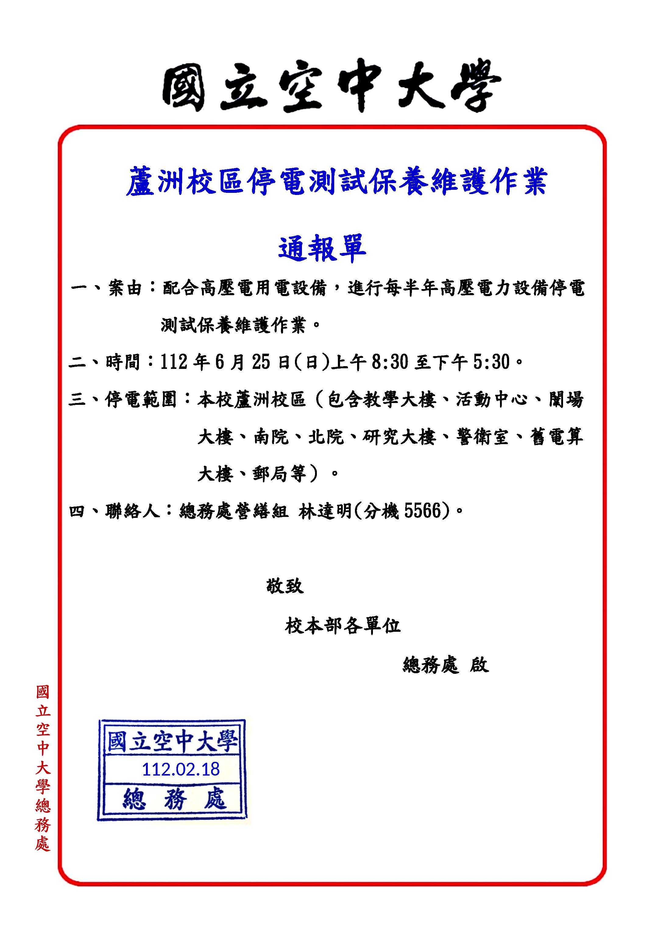 112年06月25日(日){校本部配合每半年高壓電用電設備保養維護停電公告}